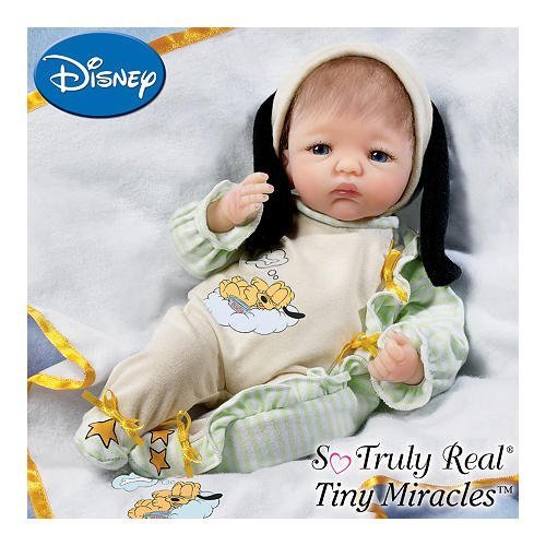 This lifelike baby doll comes with a matching blanket, decorated with "Baby Pluto" Disney art and golden, satiny edging